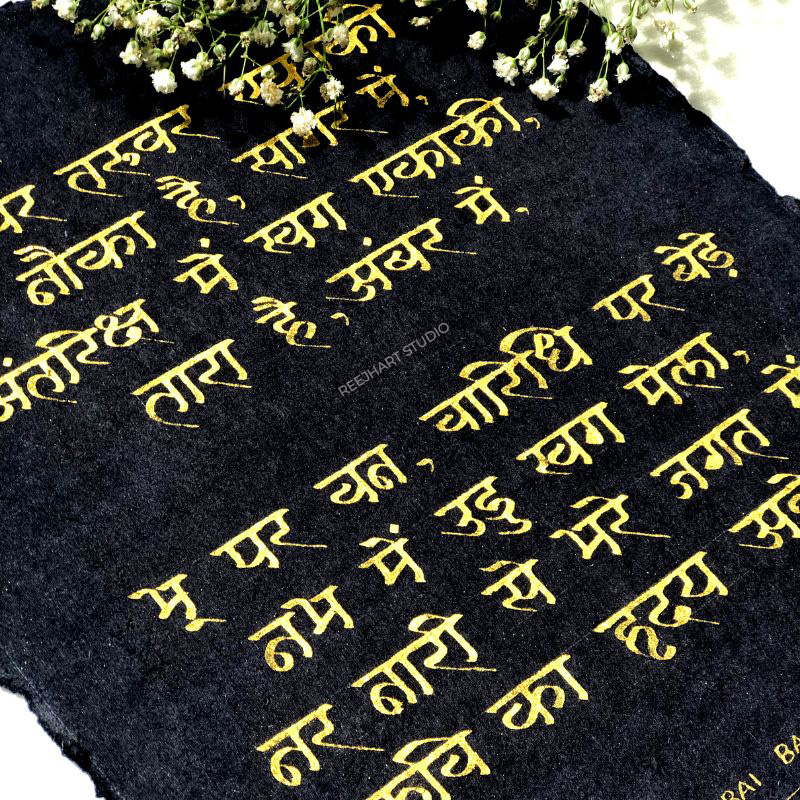 Commissioned Artwork Harivansh Rai Bachan’s poem. Devanagari Calligraphy with gold ink on handmade paper. Our commissioned piece offers a unique blend of artistry and heritage, featuring the renowned poet’s words intricately written in stunning gold ink on exquisite handmade paper. Each stroke of the calligraphy brush captures the essence of Bachchan’s poetry, bringing to life …