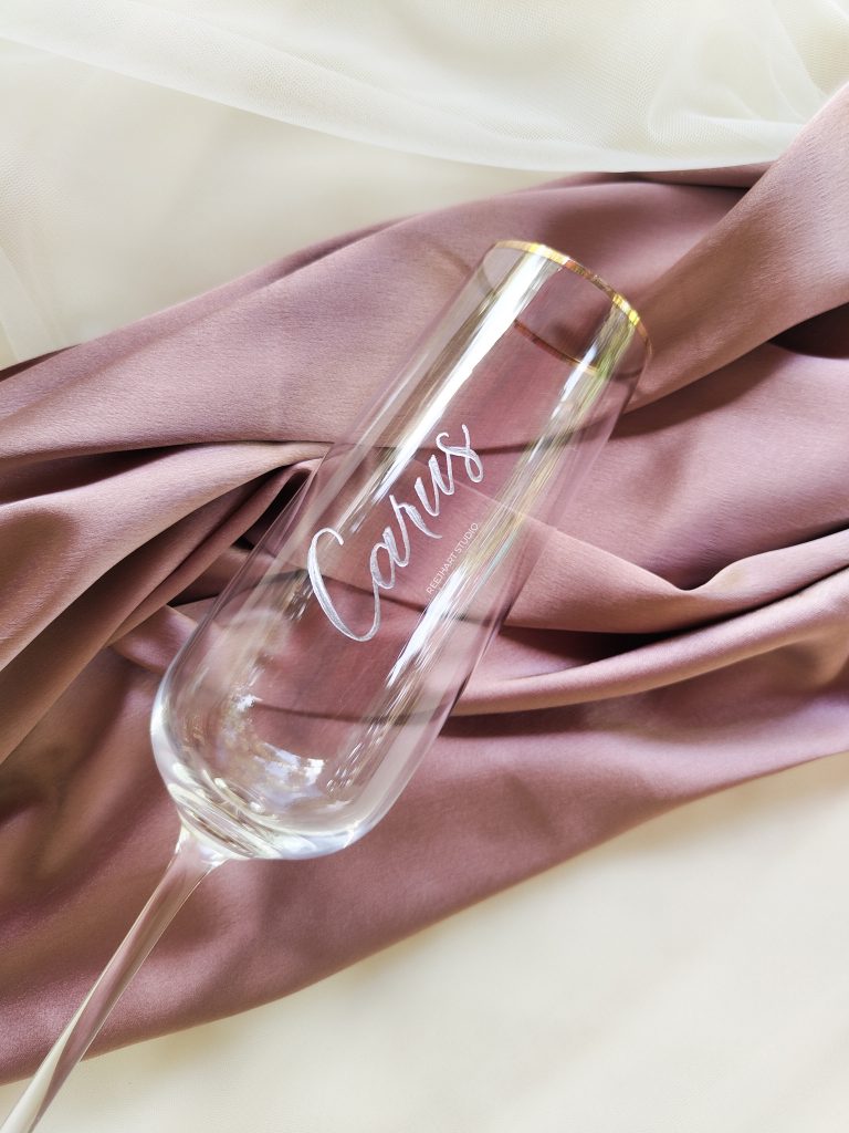Champagne Flute Engraving Introducing our exquisite hand-engraved champagne flutes with a touch of class and opulence, featuring a lavish gold rim. These aren’t just glasses; they are personalized masterpieces crafted for a special wedding celebration. As wedding favors, one of our many clients, the bride, took a more personal step of placing each flute in …
