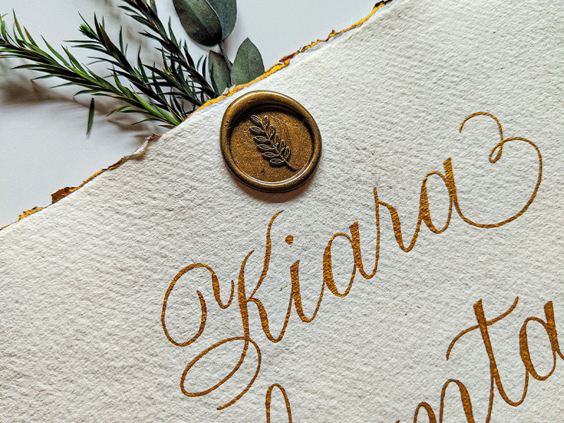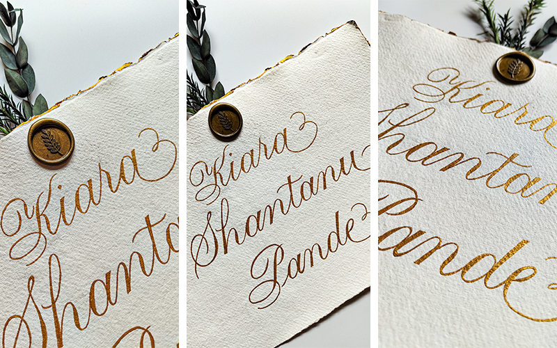 Imagine the moment when you unveil your new name for the first time as you embark on this beautiful journey of marriage. With delicate strokes of gold paint adding to the beauty of something as creative as a handmade paper, your name gets transformed into a work of art by the classic style of copperplate calligraphy.