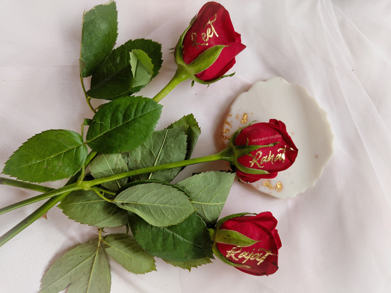 We delicately hand-letter messages of love and endearment onto each velvety petal, infusing the red roses with a touch of personalized charm. Whether it's a sweet note, a romantic quote, or simply the recipient's name, the artistry of hand-lettering adds an extra layer of sentiment to the timeless beauty of red roses.