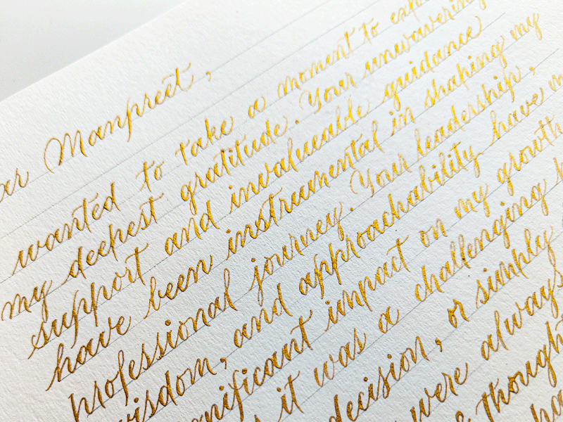 Our calligraphy services offer a unique way to express gratitude, whether it's thanking a boss for their mentorship and support, expressing love and affection to a significant other, or commemorating a special occasion with beautifully crafted invitations and announcements. With the delicate strokes of gold ink and the graceful curves of modern script, our calligraphy adds a touch of luxury and refinement to your handwritten notes. Each letter is delicately crafted by hand, ensuring that every word is imbued with sincerity and warmth.