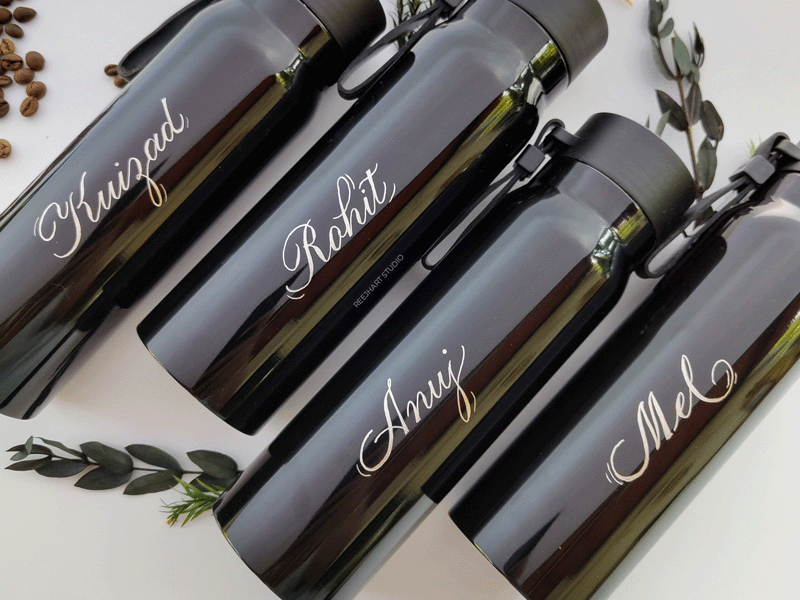 Hand engraving stainless steel thermos bottles for office colleagues. A client of ours was shifting to another country so she wanted to give her office colleagues the perfect goodbye present.