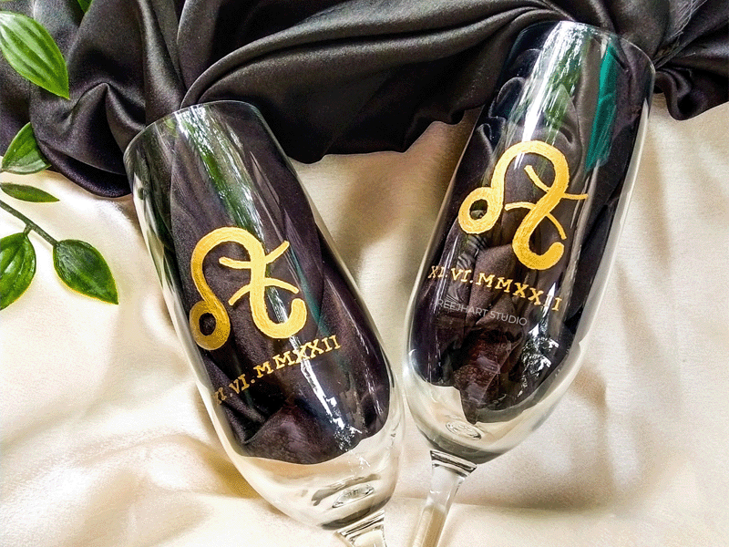 To enhance the elegance of these champagne flutes, the engraving is elevated with a golden filling. The golden accents add a touch of opulence, turning each flute into a shimmering canvas that reflects the warmth and radiance of the couple's love.