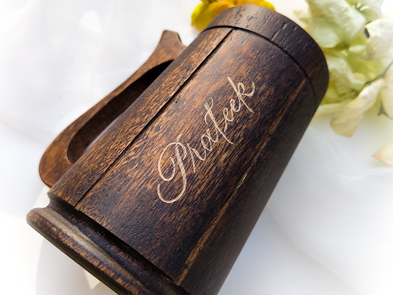 Unlike glossy or slippery surfaces, the non-slippery and non-glossy nature of the wooden beer mug adds to the authenticity of the engraving. No wax filling is added, allowing the engraving to seamlessly integrate with the mug's natural texture. The tactile feel of the engraved words against the warm wood enhances the overall sensory experience of enjoying a favorite beverage.