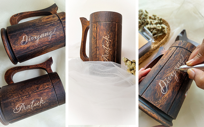 The beauty of blind engraving on this mug lies in the subtlety of the etching process. As the modern calligraphy script is delicately engraved onto the wooden surface, the natural texture of the wood becomes a canvas for your personalized message. The result is a tactile and visual delight, where each stroke reveals the inherent beauty of the wood.